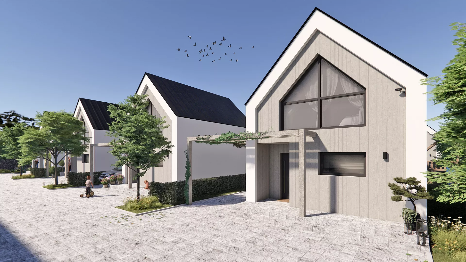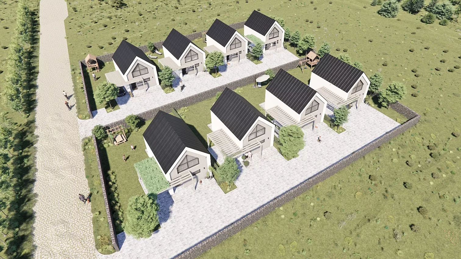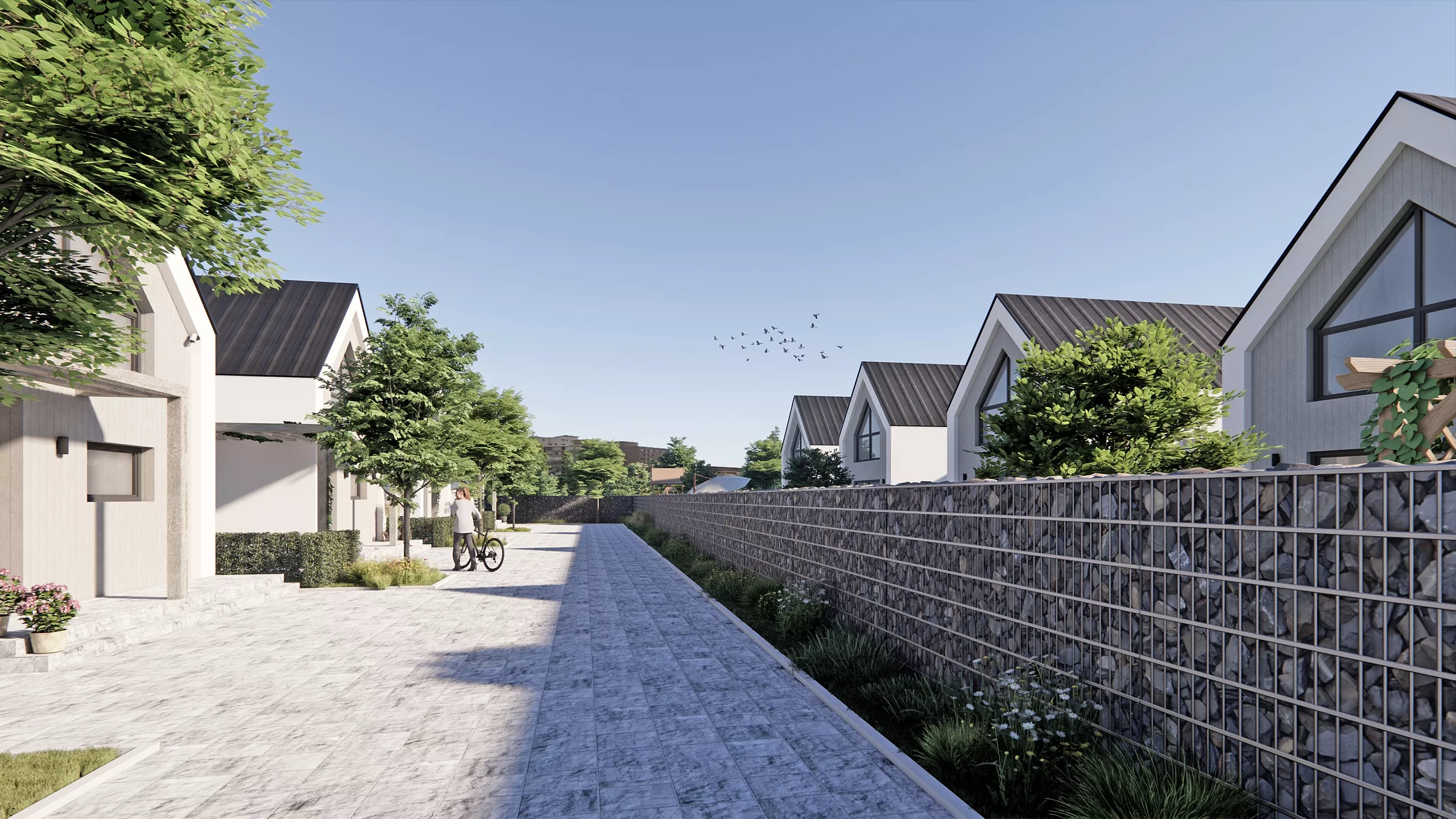 Inwestycja obejmuje kameralne osiedle składające się z ośmiu budynków, usytuowanych w sposób zapewniający mieszkańcom prywatność oraz optymalne nasłonecznienie. Projekt kładzie duży nacisk na ekologię i zrównoważone gospodarowanie wodą, czego wyrazem są zaprojektowane systemy szczelnych ogrodów deszczowych, wspomagające retencję wód opadowych na terenie działki. Całość założenia dopełniają utwardzone podjazdy i tarasy oraz starannie zaplanowana zieleń, tworząc harmonijną przestrzeń do życia, która łączy nowoczesny design z troską o środowisko naturalne.