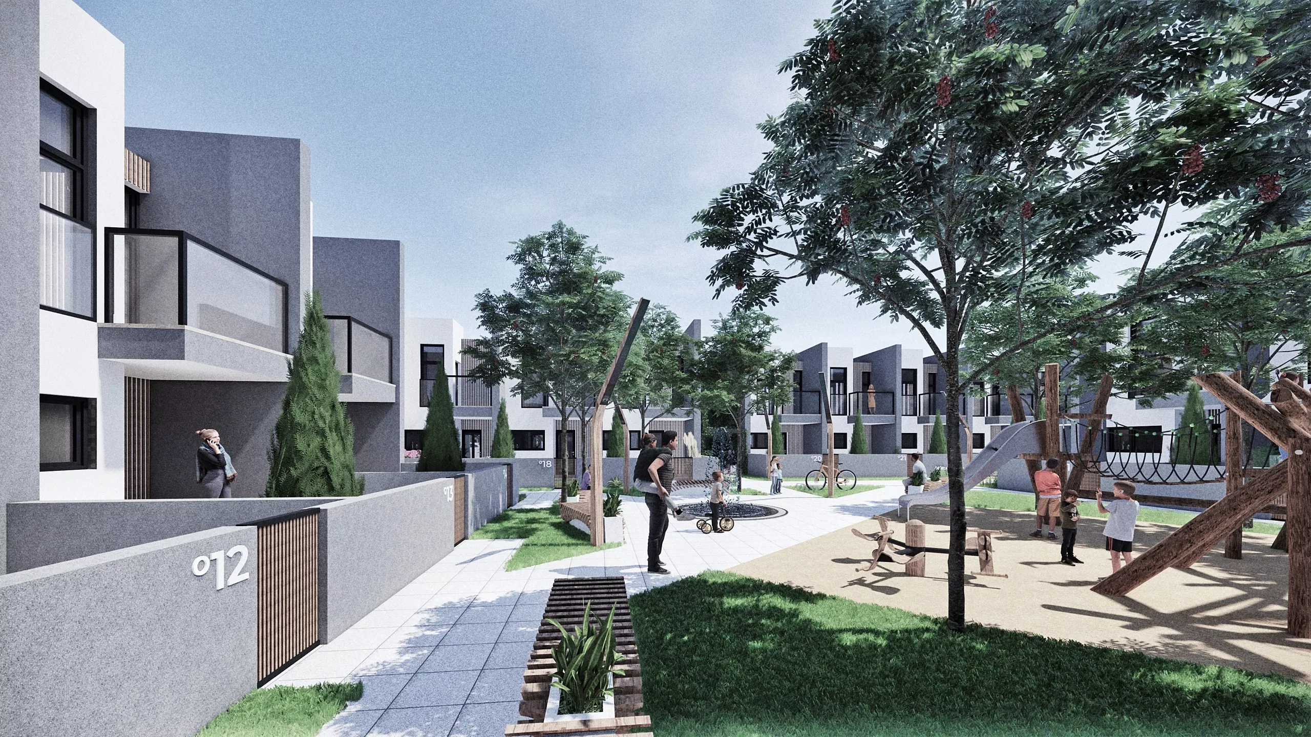 Dodatkowe, atrakcyjne przestrzenie wspólne z przestrzenią rekreacyjną na dziedzińcu wypełnione zostały zielenią wysoką i średnią. Wyciszą przestrzeń między budynkami, zapobiegną zapyleniu i pozwolą uzyskać przyjemny mikroklimat.