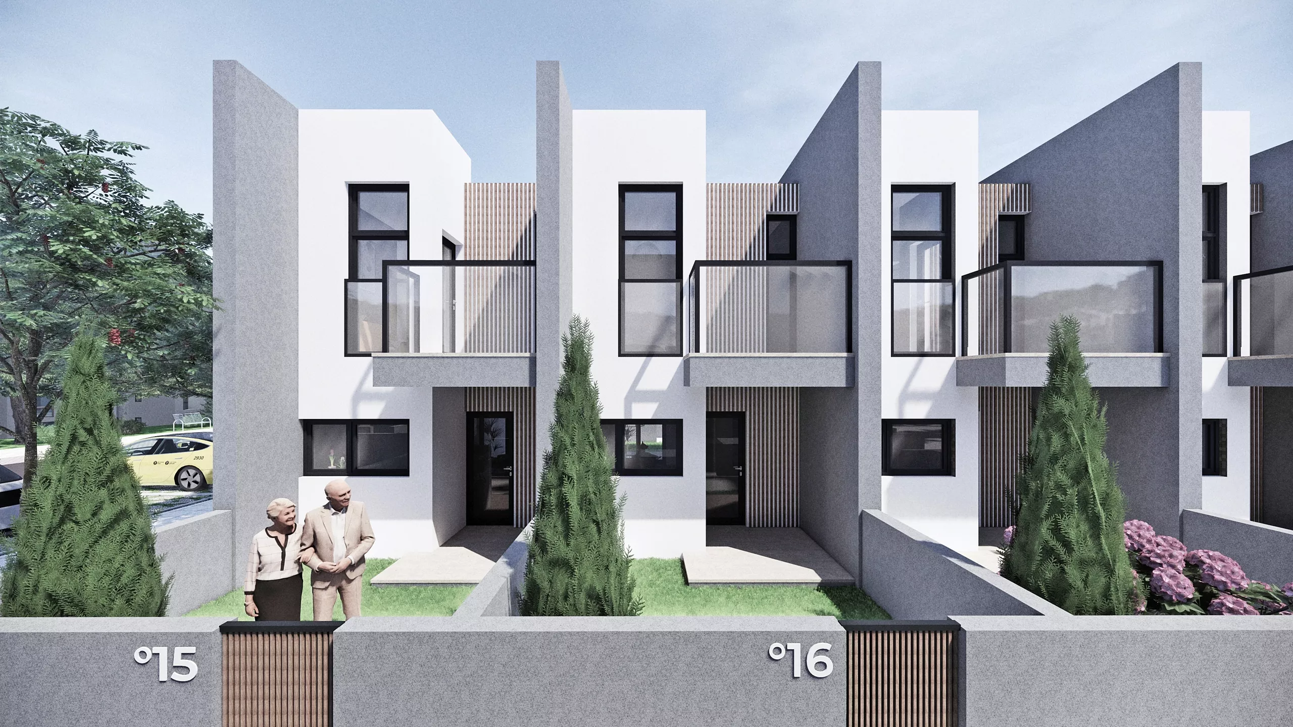 Każdy z budynków posiada własny ogródek od strony dziedzińca oraz od strony wejściowej.