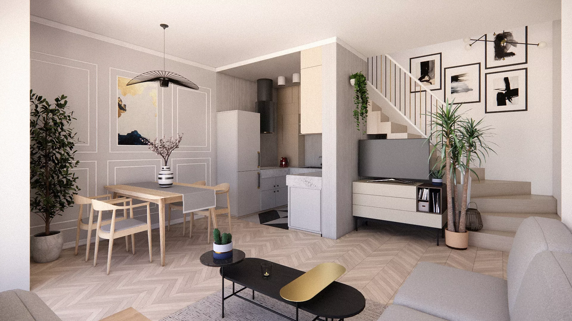 salonu z aneksem kuchennym (z możliwością wydzielenia jako pomieszczenia z osobnym wejściem z ogólnodostępnego holu), WC oraz przedsionku na parterze, oraz dwóch sypialni i łazienki na piętrze. Komunikacja została okrojona do minimum, tak by maksymalnie wykorzystać powierzchnię pomieszczeń.